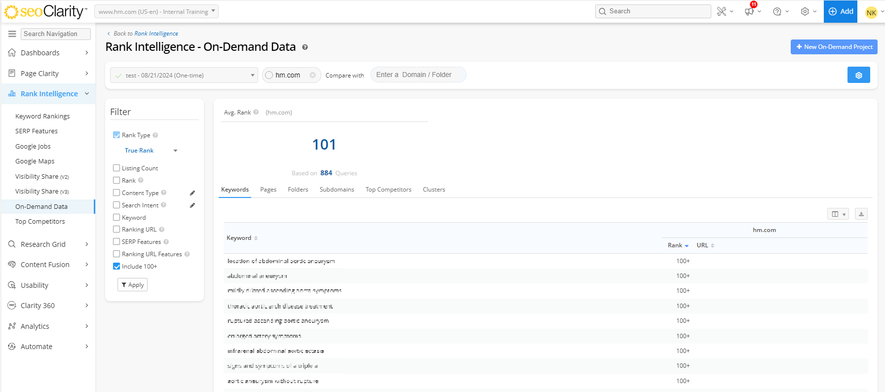 On-Demand Rank Intelligence data, formerly known as Ad-Hoc Data, allows for on-the-fly analysis of keywords' rank or Average Search Volume checked using the On-Demand Data Retrieval setting. The keywords do not need to be part of your managed or tracked keyword set in Rank Intelligence. This is ideal for one-off research, competitor analysis, or exploring new keyword opportunities without affecting your KSQ limits on your subscription.