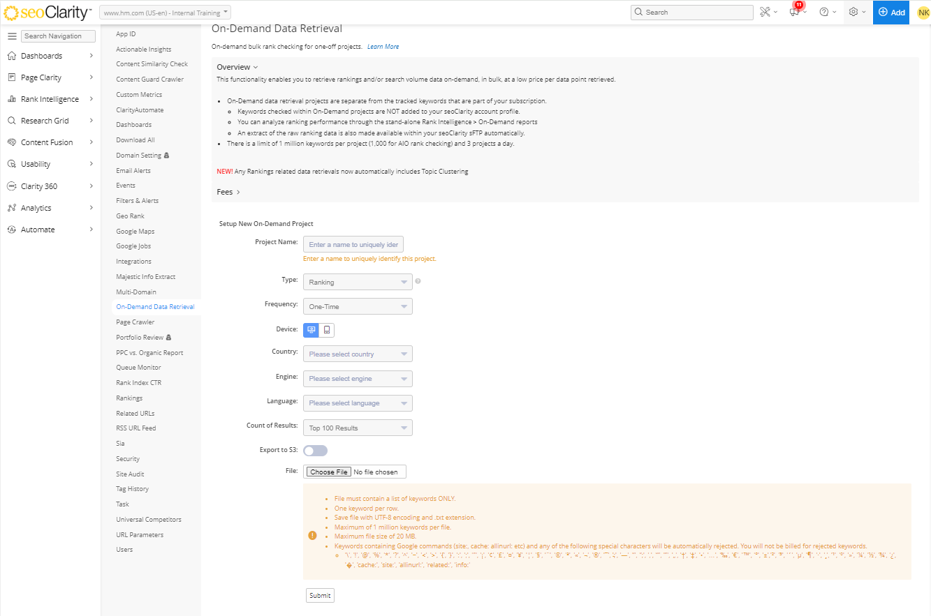 On-Demand Data Retrieval must be enabled and a project must be created in On-Demand settings for data to be available in Rank Intelligence On-Demand Ranking or be available via export to sFTP or S3 location. No more than 1 million keywords can be submitted per file, and file size must not exceed 20 MB. Up to 3 unique On-Demand retrieval projects can be created per day per domain profile. Daily On-Demand rank projects greater than a single day will count each day as a separate project.