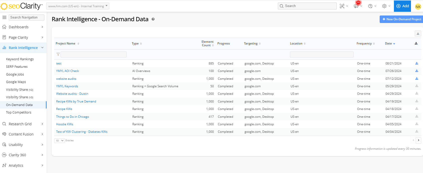 On-Demand Data Retrieval projects allow you on-demand access to ranking data. Use it for large-scale rank or search volume checks, without having to add keywords to your managed or tracked keywords set, and without affecting your KSQ limits on your subscription. Using On-Demand Data also avoids impacting your regular performance trends.