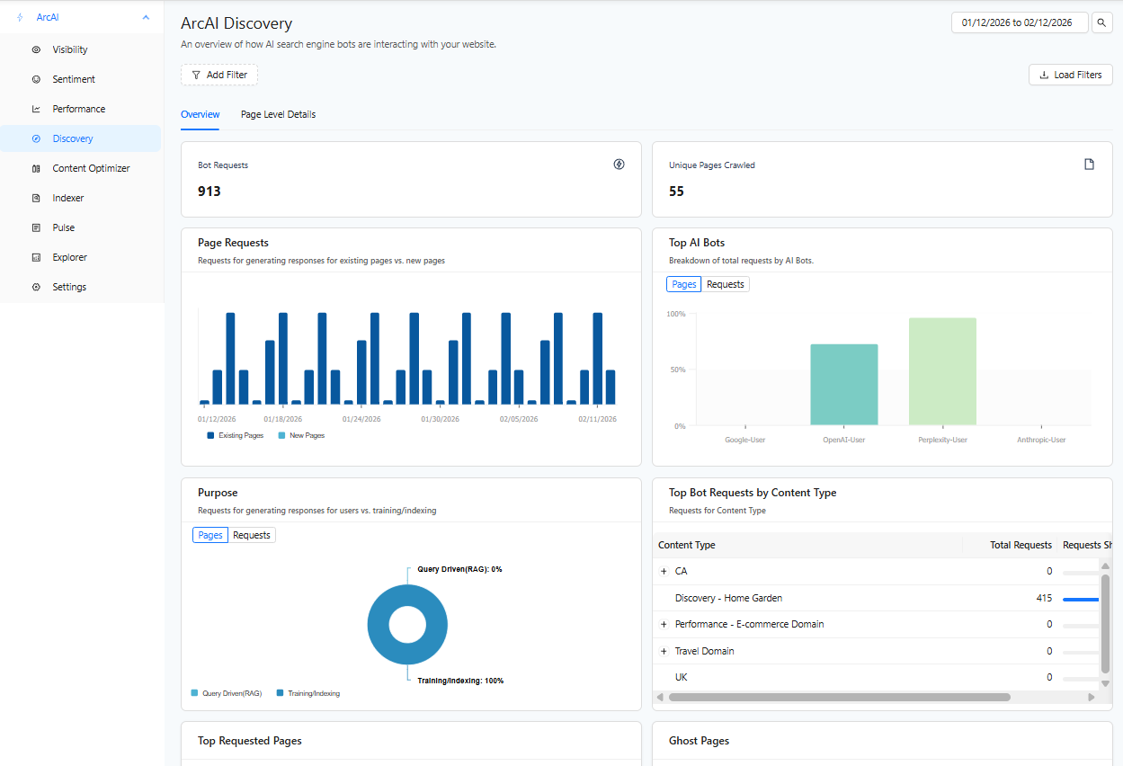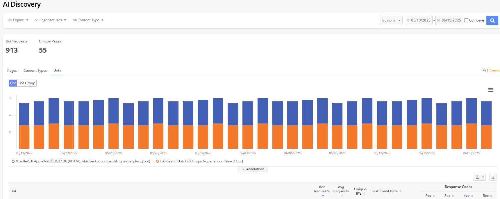 The AI Discovery report allows you to monitor how AI search engine bots, like ChatGPT and Perplexity, are interacting with your site based on how they are crawling and retrieving data. By analyzing the bot activity, you can gain understanding into what is potentially used for model training or answer generation. This feature collectively provides a comprehensive view of AI bot interactions with your site, enabling strategic content management and search optimization.
