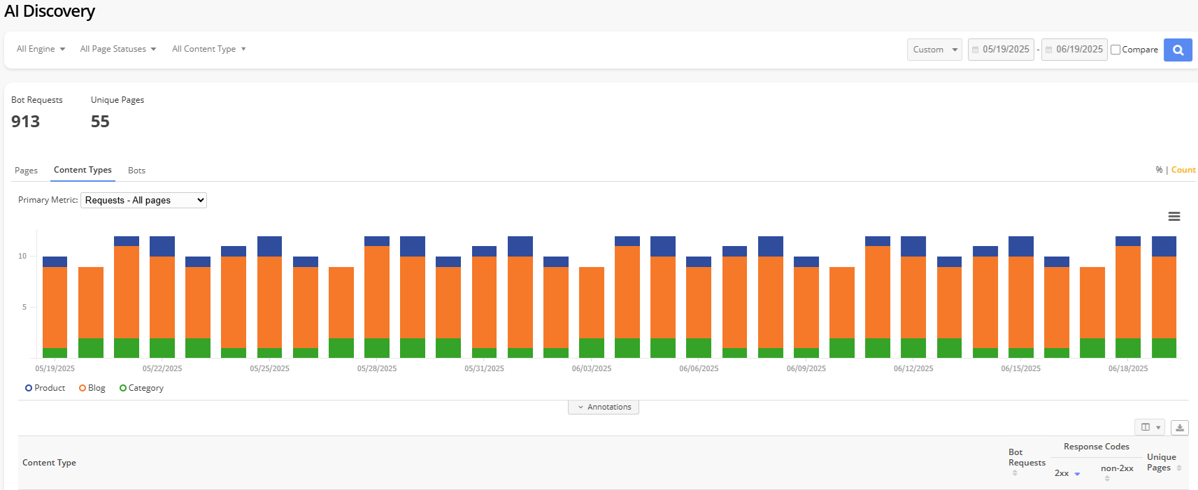 Content Types: Displays the AI bot requests broken down by Content Type. View options include: requests for all pages, requests for new pages, requests for existing pages, the count of all pages, the count of new pages, the count of existing pages, or the count of unique pages.
