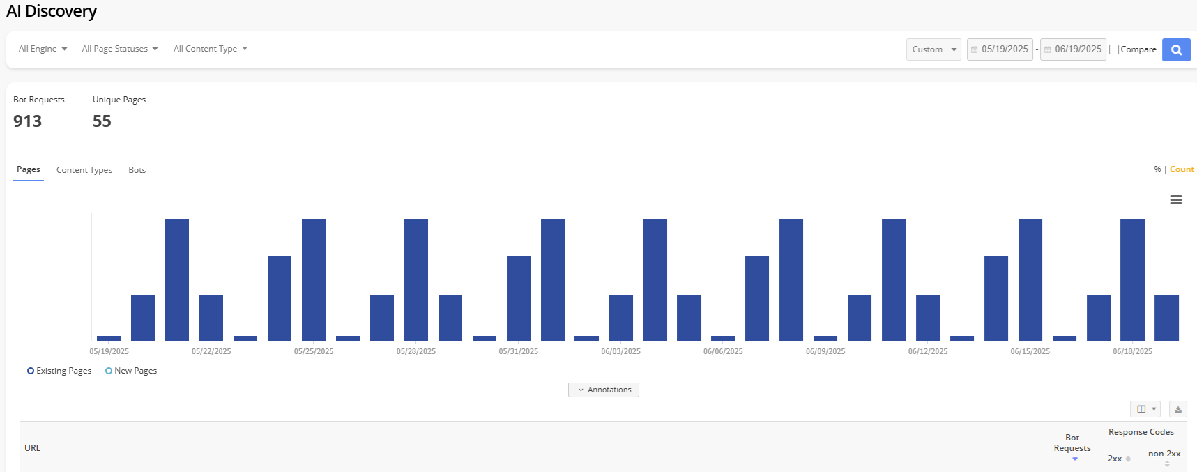 Pages: Displays the count of new and existing pages that have been visited by AI engines. New pages are those that bot logs show have not been visited by an AI engine.