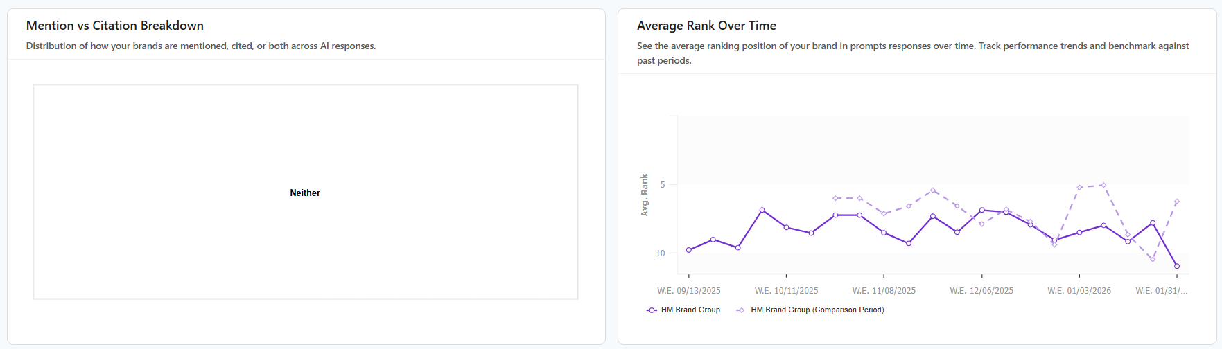 Average Rank Over Time: Follow your brand’s progress in AI responses. This helps you track performance trends and see how your current visibility compares to previous periods.