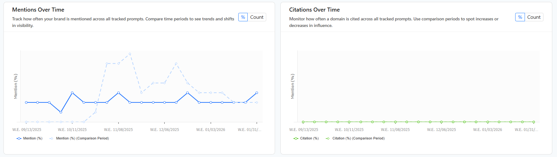 Mention %: How often AI search references your brand name when answering a prompt.