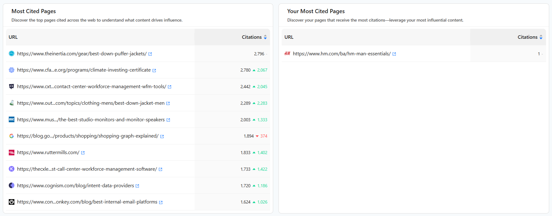 Most Cited Pages: Discover the top pages cited across the web to understand what content drives influence.