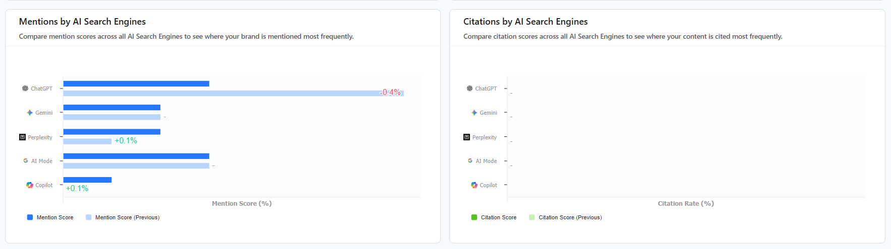 Citations by AI Search Engines: Compare citation scores across all AI Search Engines to see where your content is cited most frequently.