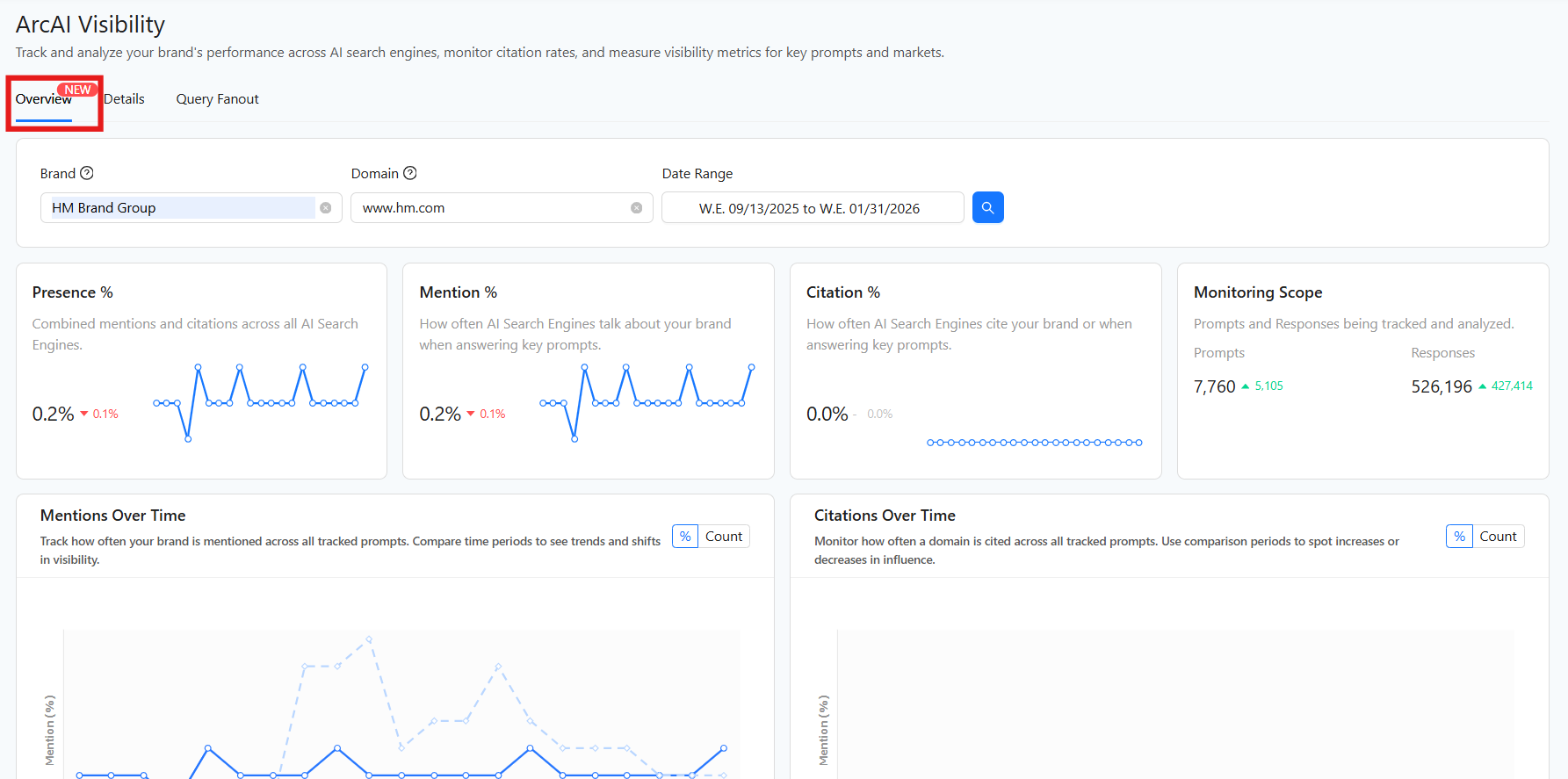 The ArcAI Visibility Overview tab is the dashboard where you get a trended view of the key performance indicators (KPIs) for your brand’s performance in AI search. This comprehensive overview helps you track your brand’s visibility in AI search by consolidating all the main metrics into one view.