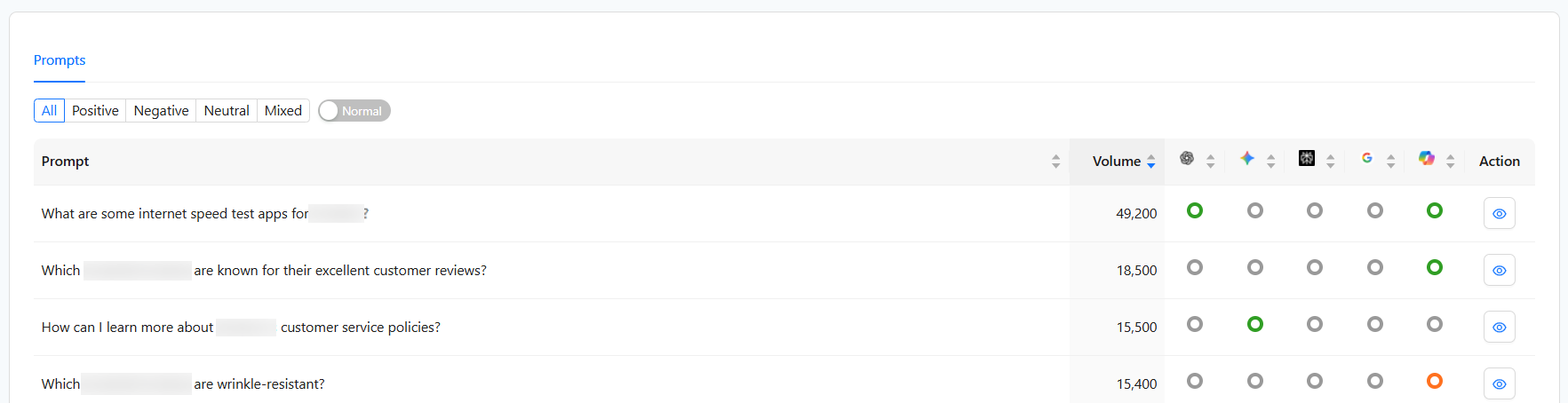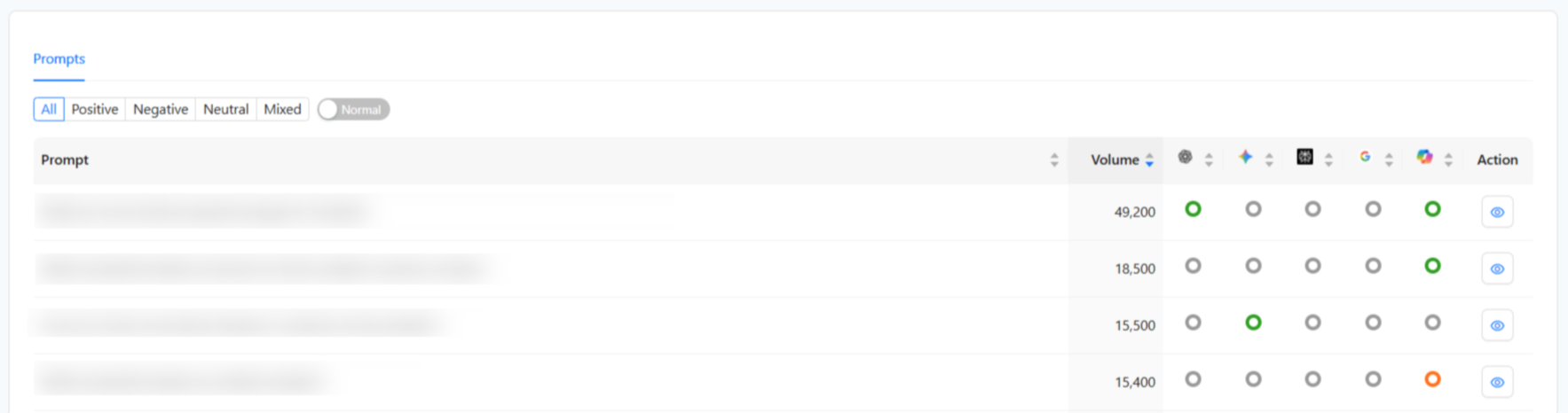Normal View: Displays the immediate state of your prompts and their latest sentiment scores. Green circle indicates positive, gray indicates neutral and red indicated negative sentiment.