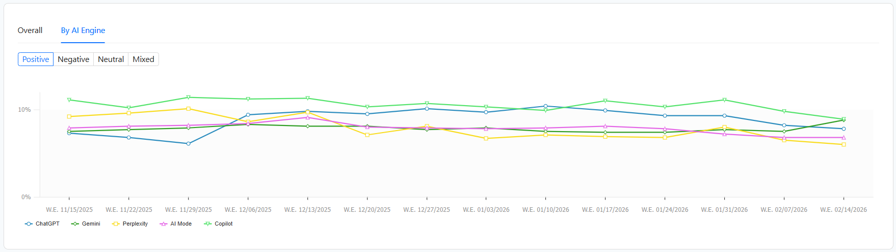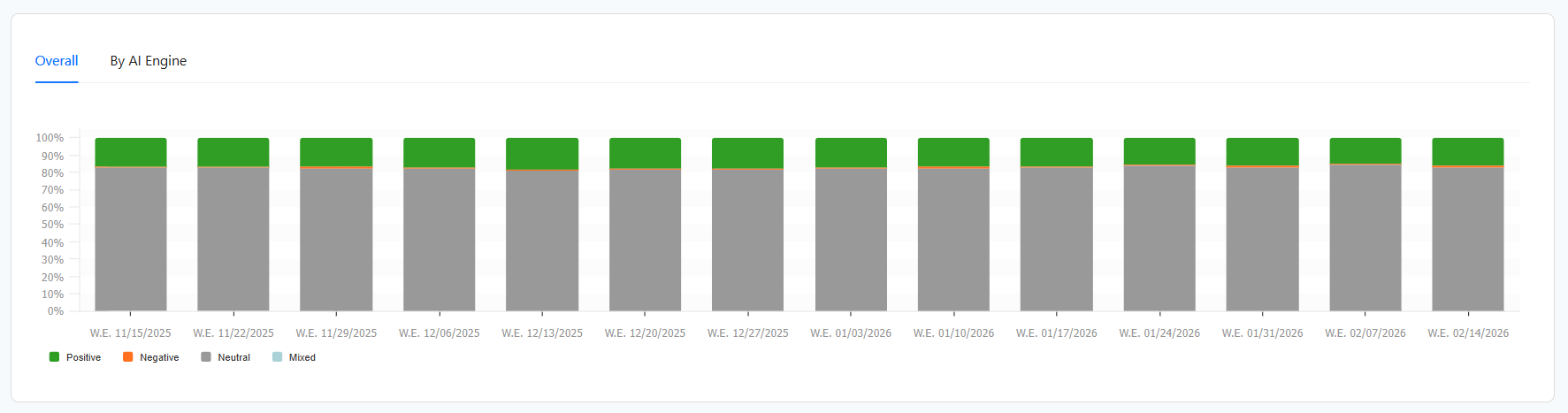 The Overall chart visualizes how your brand's sentiment has changed over time and how the AI's opinion of you is shifting week by week. By tracking the ratio of positive, negative, neutral, and mixed responses over time, you can instantly see if your overall AI narrative is improving or if a specific week triggered a spike in negative coverage.