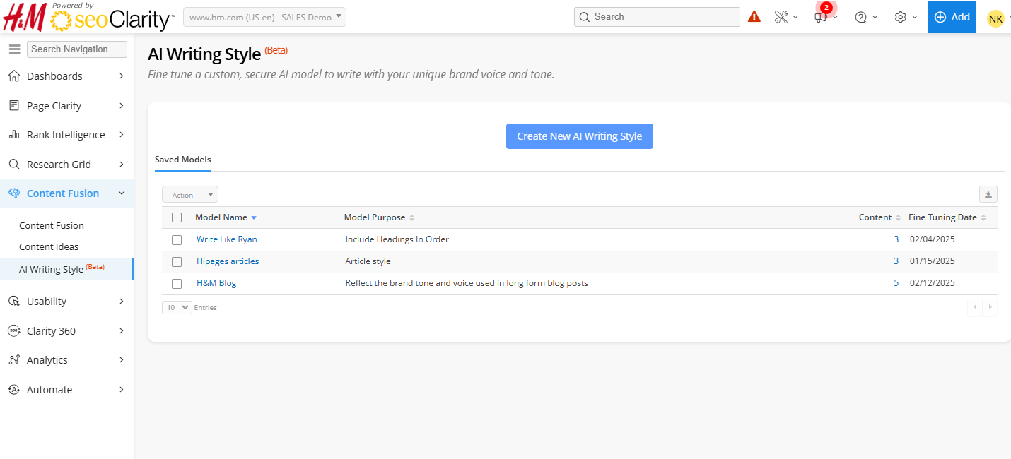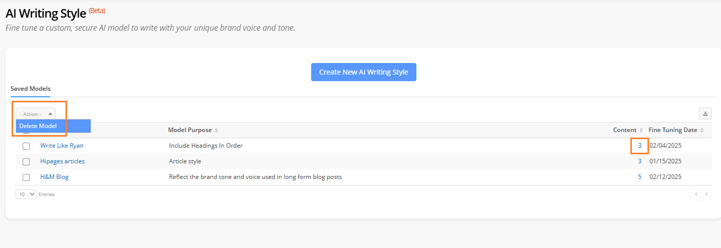 - Click on the model's name or content number to view, edit, and fine tuning your saved writing style models.