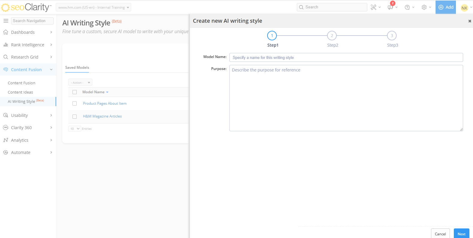 Create and fine tune your AI driven content creation prompts. Customize Content Fusion's output to your unique brand voice using Content Fusion's AI Writing Style feature.