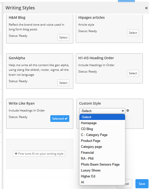 - Choose a writing style you created based on your supplied writing samples.