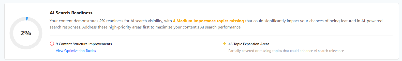 Provides a readiness score indicating how well your content is optimized for AI search visibility.
