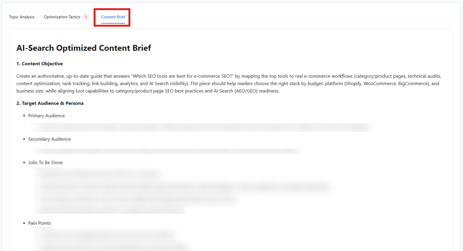 Content Brief provides a brief that can be shared with your team, summarizing analysis findings, target audience insights, and AI-friendly content structures.
