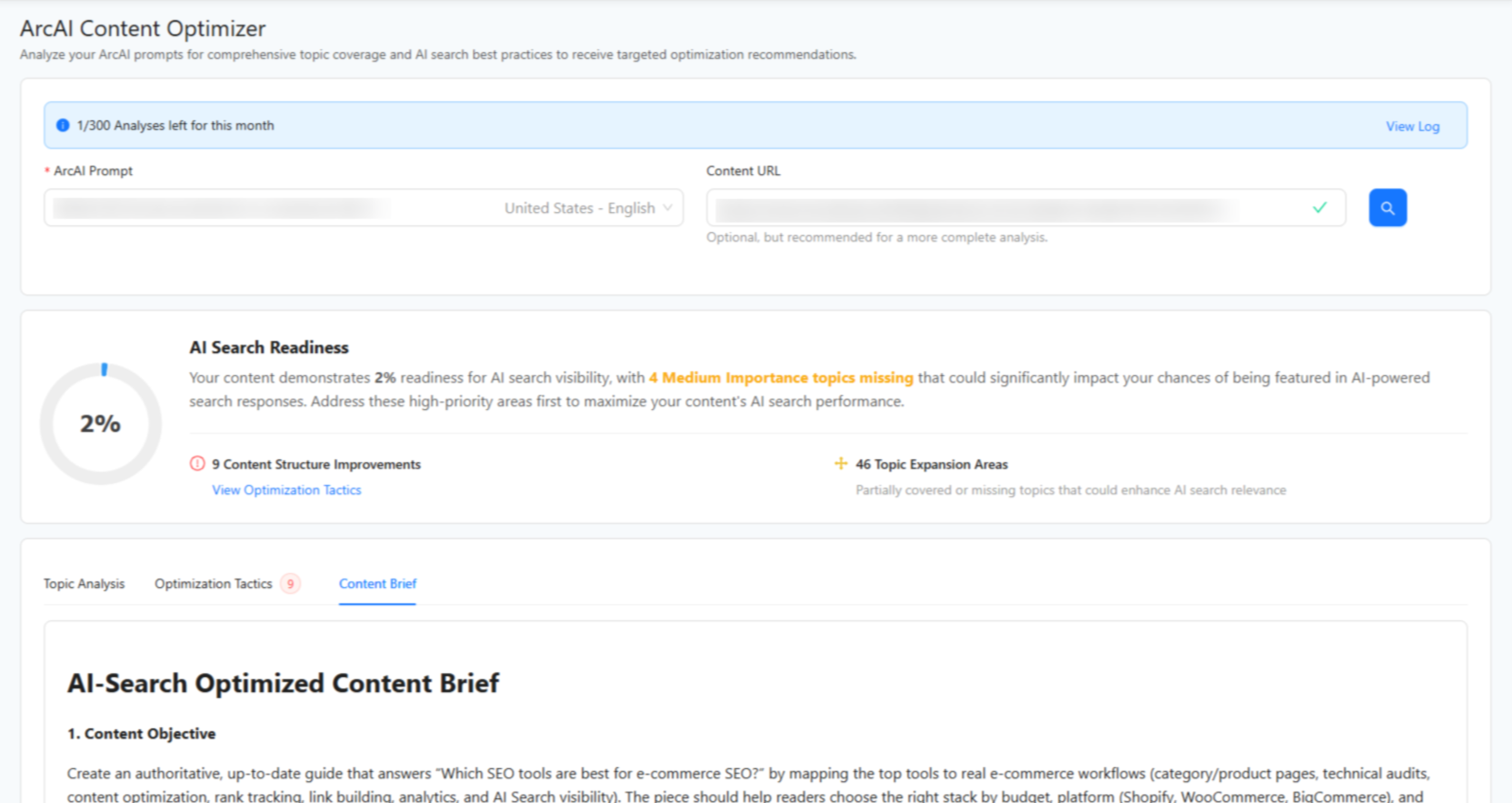 Welcome to the Content Optimizer Analysis! When you begin an analysis, you'll gain access to a detailed evaluation of your landing page content and AI search results. Our tool offers insights into your content's strengths and identifies opportunities for enhancement, ensuring your material is optimized for maximum visibility in AI-driven searches. Explore features such as readiness scoring, gap analysis, and structural evaluation to refine your content strategy effectively.