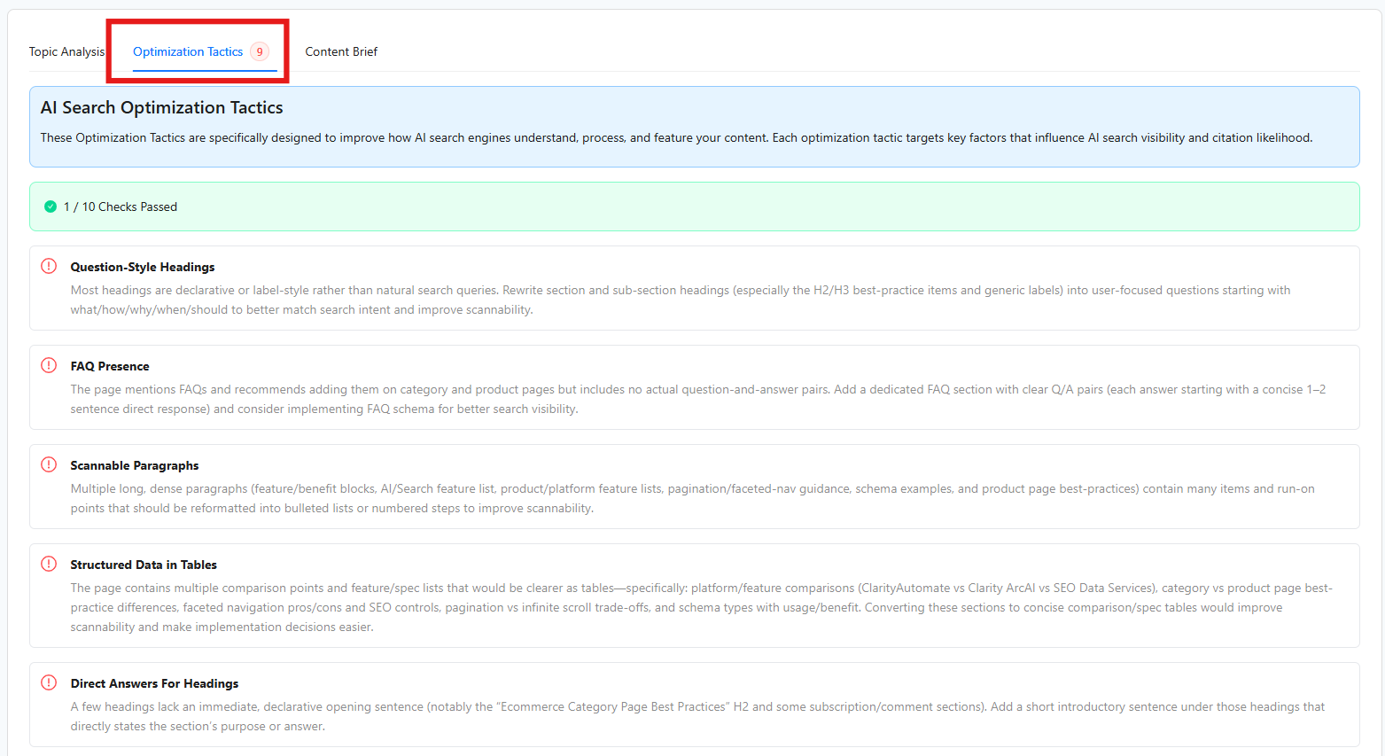 The optimizer examines your landing page content and AI search results to identify strengths and areas for improvement.