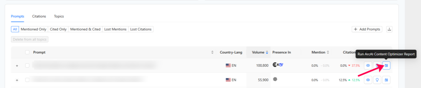 Initiate a session directly from Arc AI Visibility by selecting the optimized icon on the desired prompt. Select Run ArcAI Content Optimizer Report.