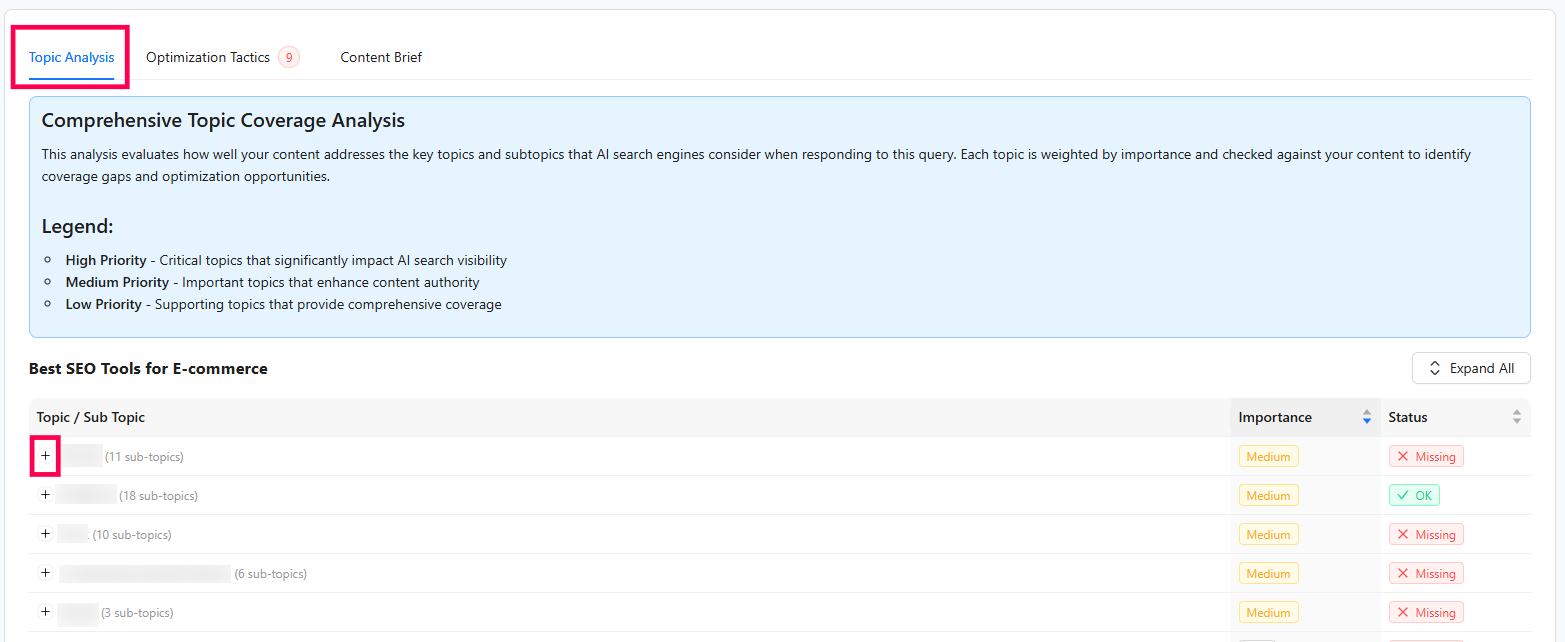 Gap analysis highlights critical optimization gaps that could affect your content’s chance of being featured in AI search results and focuses on missing topical areas of high to medium importance. It lists all relevant topics and subtopics for your prompt, with recommendations to address gaps.