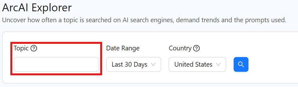 The ArcAI Explorer is designed to solve one of the most challenging aspects of AI search optimization: identifying which topics are important enough to track. As AI search engines do not typically share metrics like search volume or click-through rates, ArcAI Explorer fills this gap by estimating demand based on real usage data. This tool helps you determine which topics are most frequently searched on AI engines and the size of that search demand.