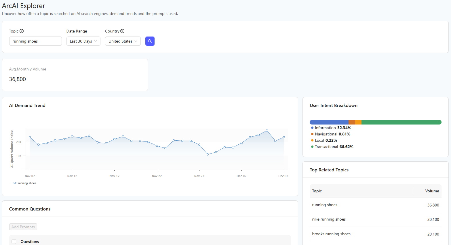 ArcAI Explorer is Topic Explorer for AI Search. Enter any topic and see the estimated search volume across all AI engines, as well as the demand trend over time, related topics, and most common questions for the topic. This quick video will give you ...