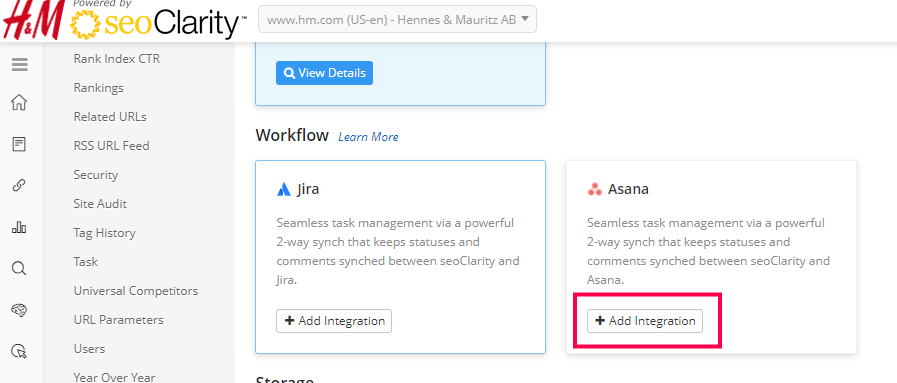 The Integration > Workflow setting allows for select task management tools to be integrated with seoClarity tasks. This integration enables a two-way, real-time synch between seoClarity’s own task management system and the chosen third party task management system.