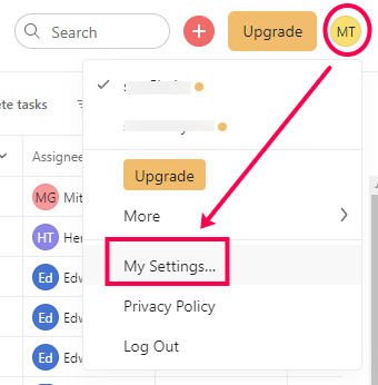 1) Login to Asana, click your profile icon at upper right, and select "My Settings."