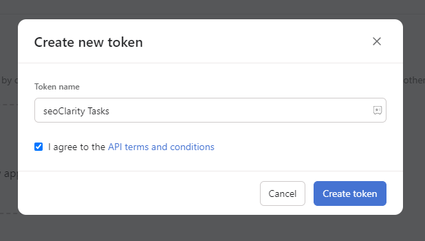 4) Give the token a name (we recommend "seoClarity Tasks" for this application), agree to the terms and conditions, and click "Create Token"