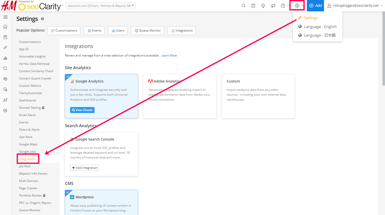 1) With the Asana Personal Access token in your clipboard memory, log in to the appropriate domain in seoClarity, and from the Settings page go to the Integrations tab.