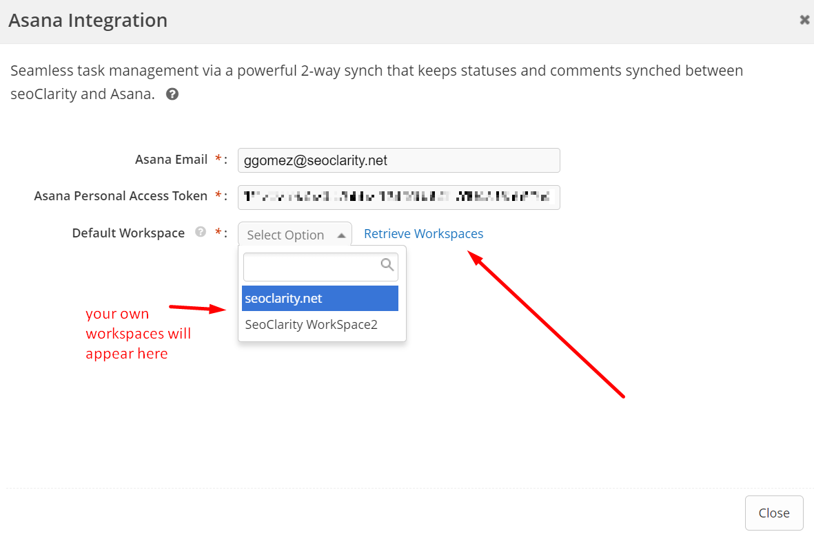 3) Enter the email you use to log in to Asana, retrieve and choose the Asana workspace that should integrate with your seoClarity tasks, and the Asana Personal Access Token you obtained using the steps above.
