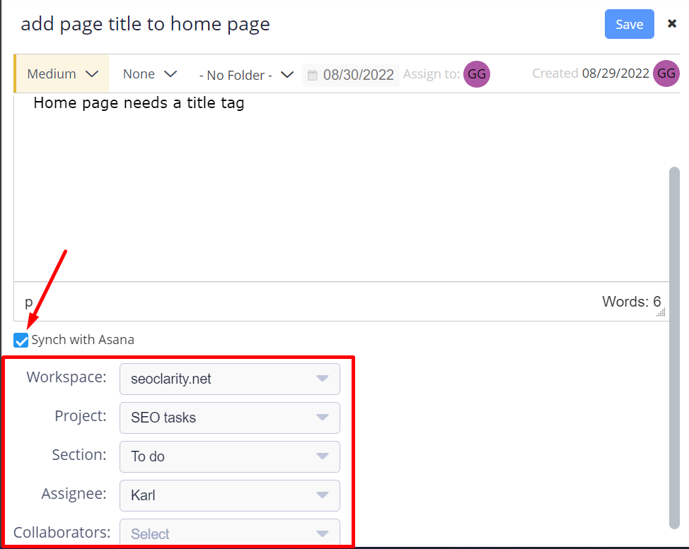 When creating a task in seoClarity, check the "Synch with Asana" box. This will allow you to enter the Asana Workspace, Project, Section, Assignee, and any Collaborators.
