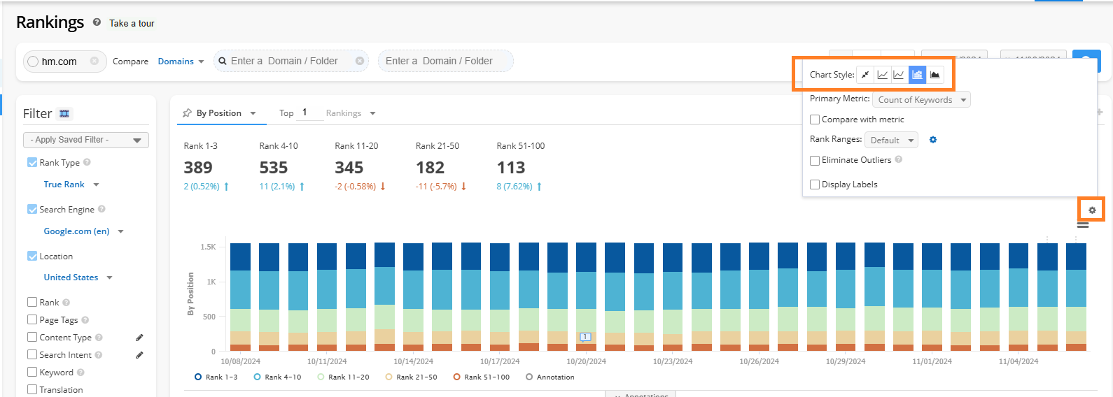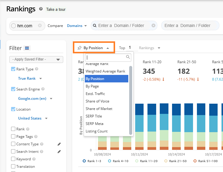 In Rank Intelligence click on the first tab above the chart to see other viewing options.