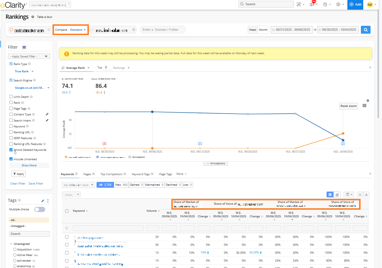 - In Rank Intelligence enter the old domain name at the top of the page using the Compare function.