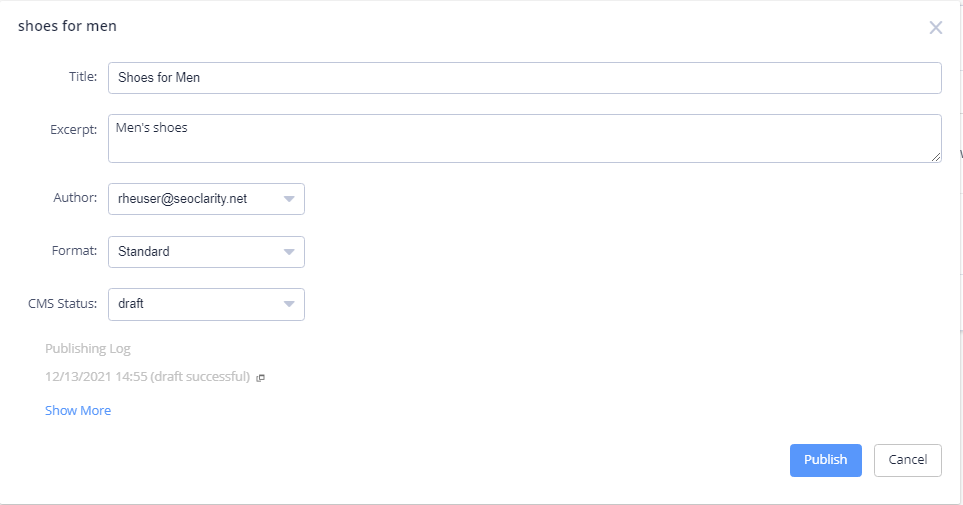 Download and install the JSON Basic Authentication plugin for Wordpress and then navigate to the Integrations tab found on the Settings page (this requires seoClarity Admin access) to select the Wordpress Integration card where user specific credentials can be input. Wordpress credentials should have a role of author, editor or admin to Publish.