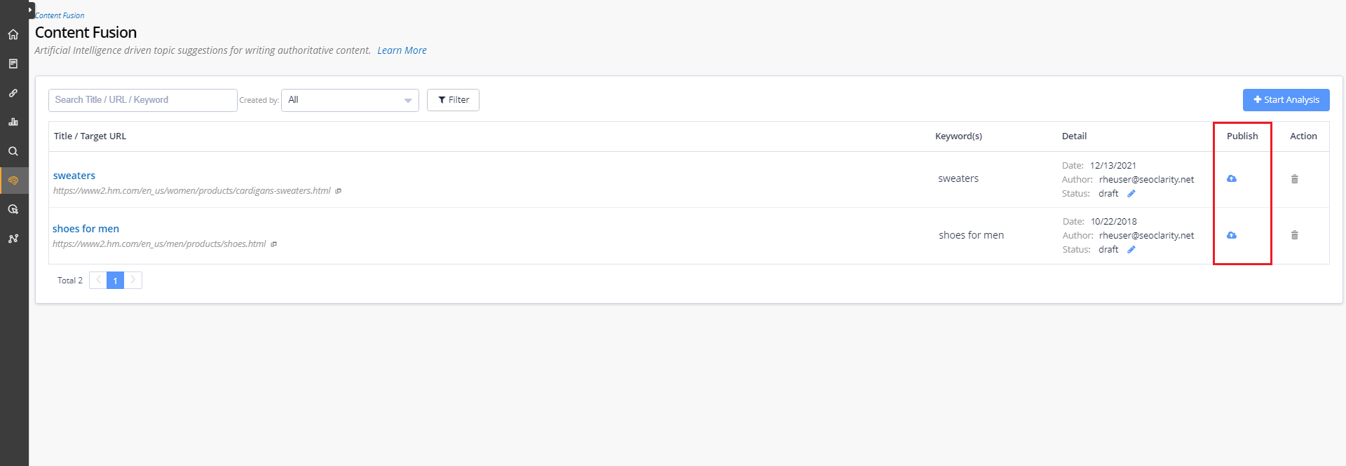 Once the requirements have been completed and credentials are input, an additional Publish column will be made available in Content Fusion.