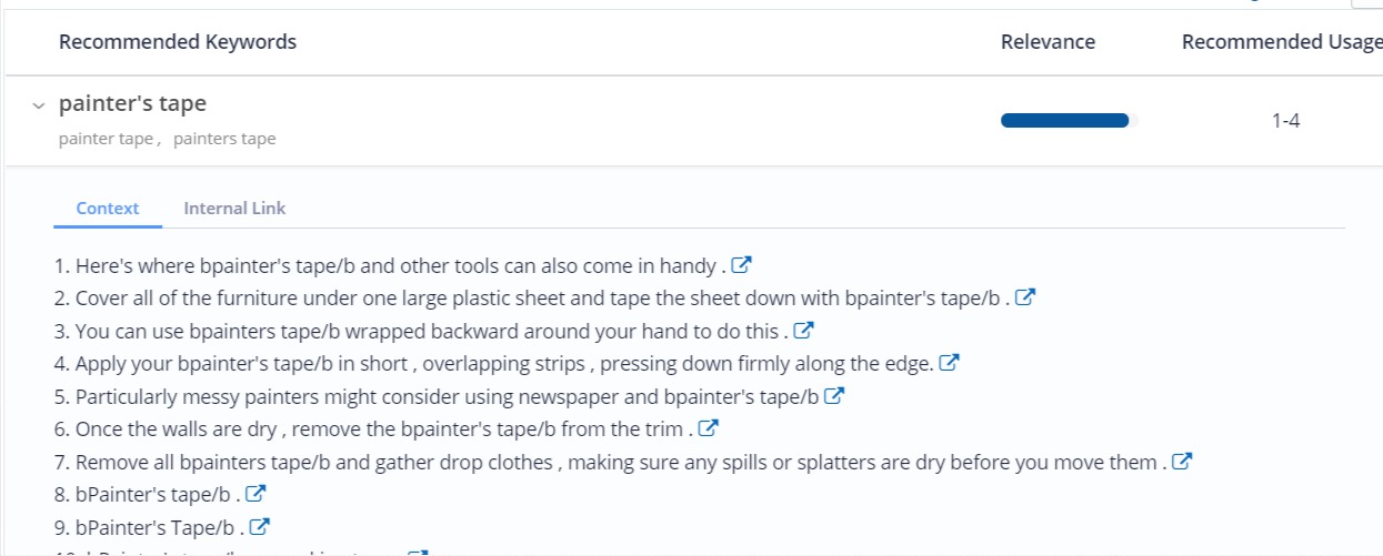 Selecting the arrow next to a keyword will expand its listing to show Context and Internal Link information: