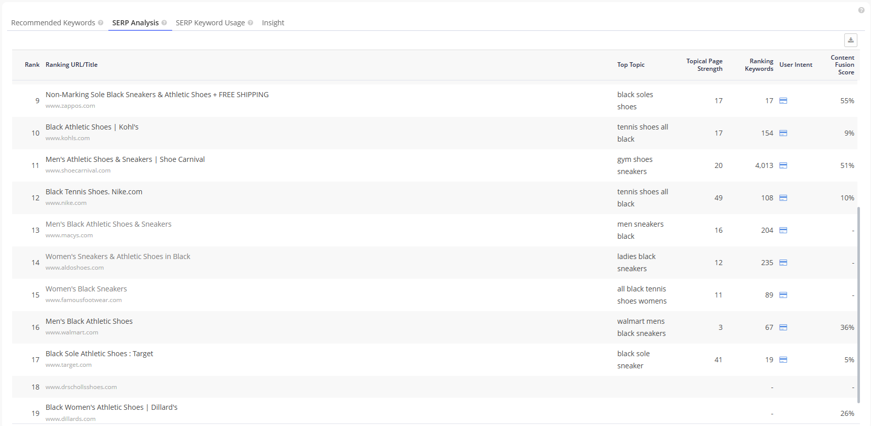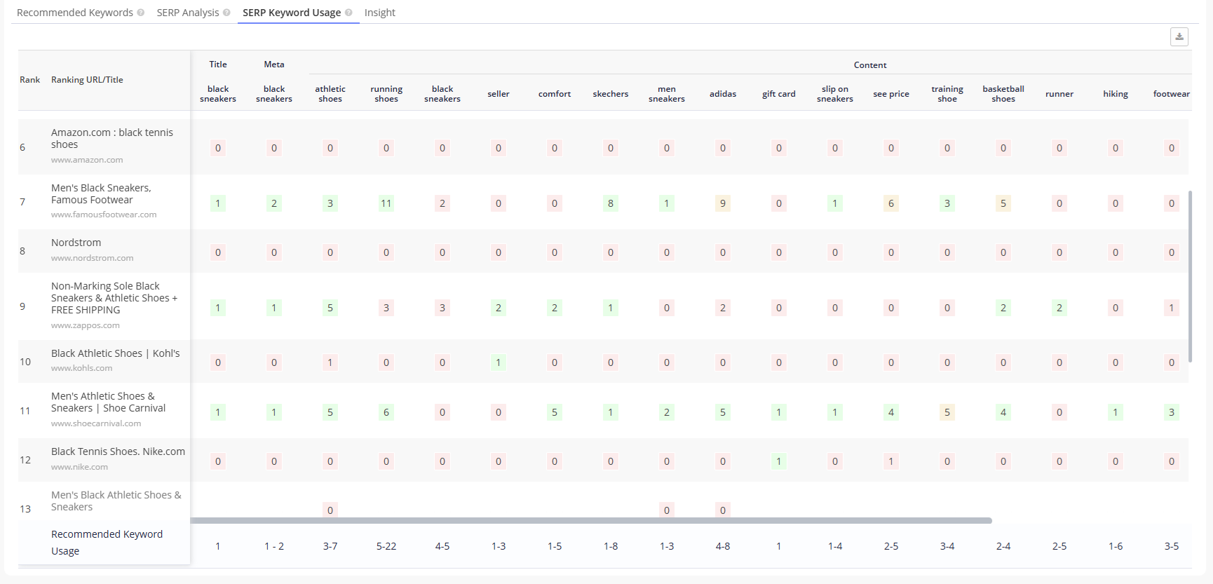 Content: Displays the usage of the recommended keywords for the page content across the top ranking URLs for the target keyword.