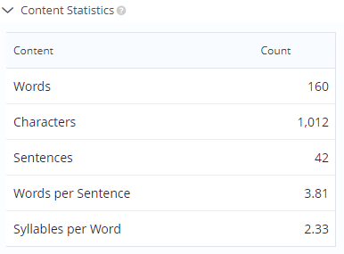 This toggle-able view displays the count of words, characters, sentences, the average words per sentence and syllables per word. Content stats are based primarily on the English language and may not reflect true measurements for other languages