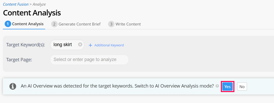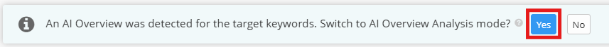 If an AI Overview was generated for your keyword during our most recent scan, Content Fusion will prompt you to switch to AI Overview Analysis Mode for even sharper insights.