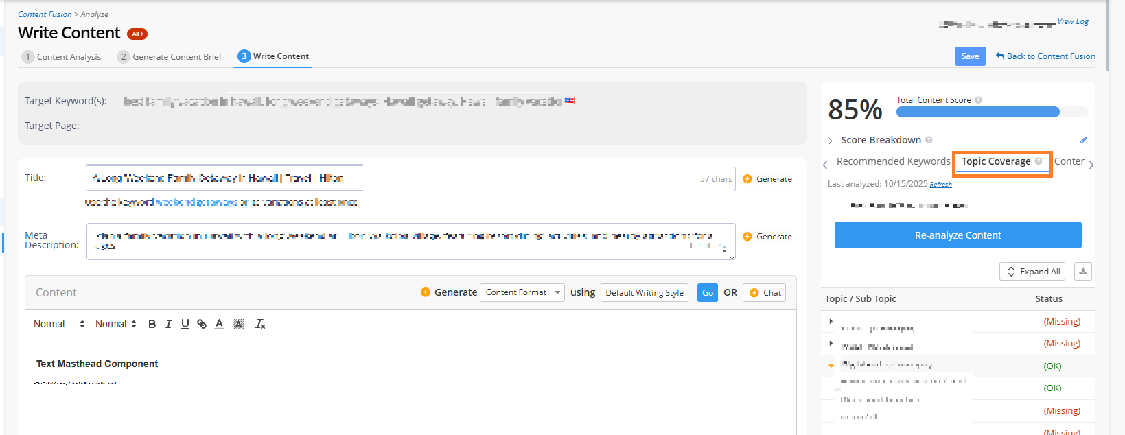 - In Content Fusion > Write Content the writer can access the Topic Coverage tab in the right sidebar. This shows all the topics and subtopics you should cover in your content to increase its attractiveness to an AIO.