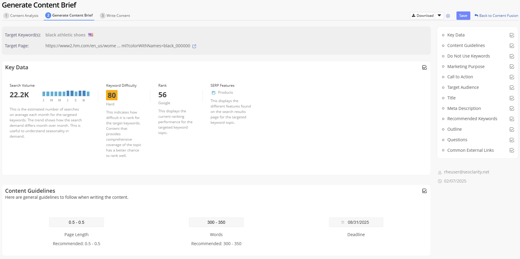 The Content Briefs view provides a customizable template that leverages user input and Content Fusion data. The platform interface can be used or for if you need greater customizability, custom templates can be modified to generate a Content Brief template by using variable placeholders in the template to retrieve the data from seoClarity.