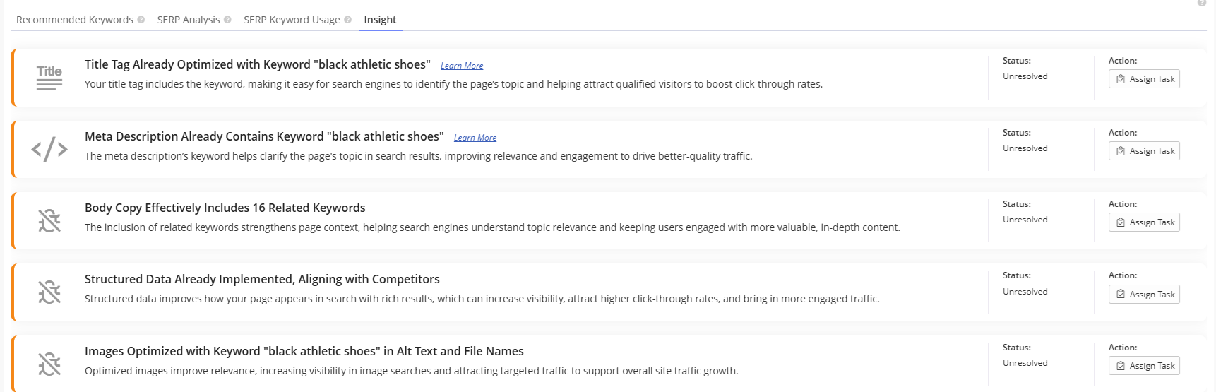 - Assign Tag: Assign a tag to the managed keyword or page being targeted by the analysis