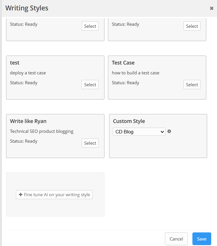 AI writing style by selecting the writing style dropdown and selecting the +Fine tune AI on your writing style from the side panel to create a new custom writing style or customize an existing writing style by selecting the gear icon next to the dropdown of the Custom Style option. IOnce created and saved, simply select the profile from the dropdown prior to generating content with Sia to use it.
