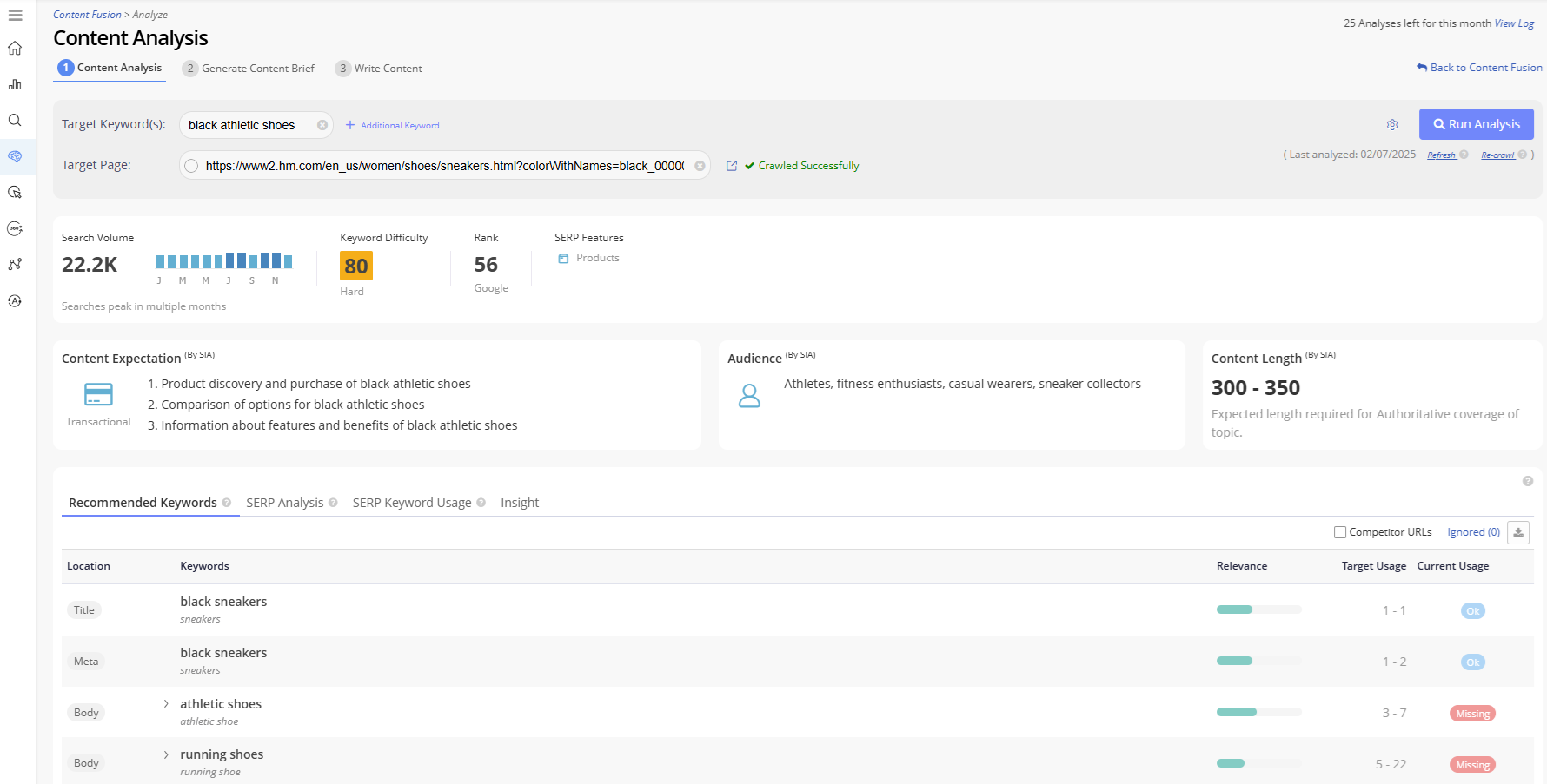 Recommended Usage: A range of how many times you should try to use the keyword in your content, based on an analysis of its frequency in the top-ranking content. This includes the count of times the keyword is used in the Write Content section of Content Fusion.