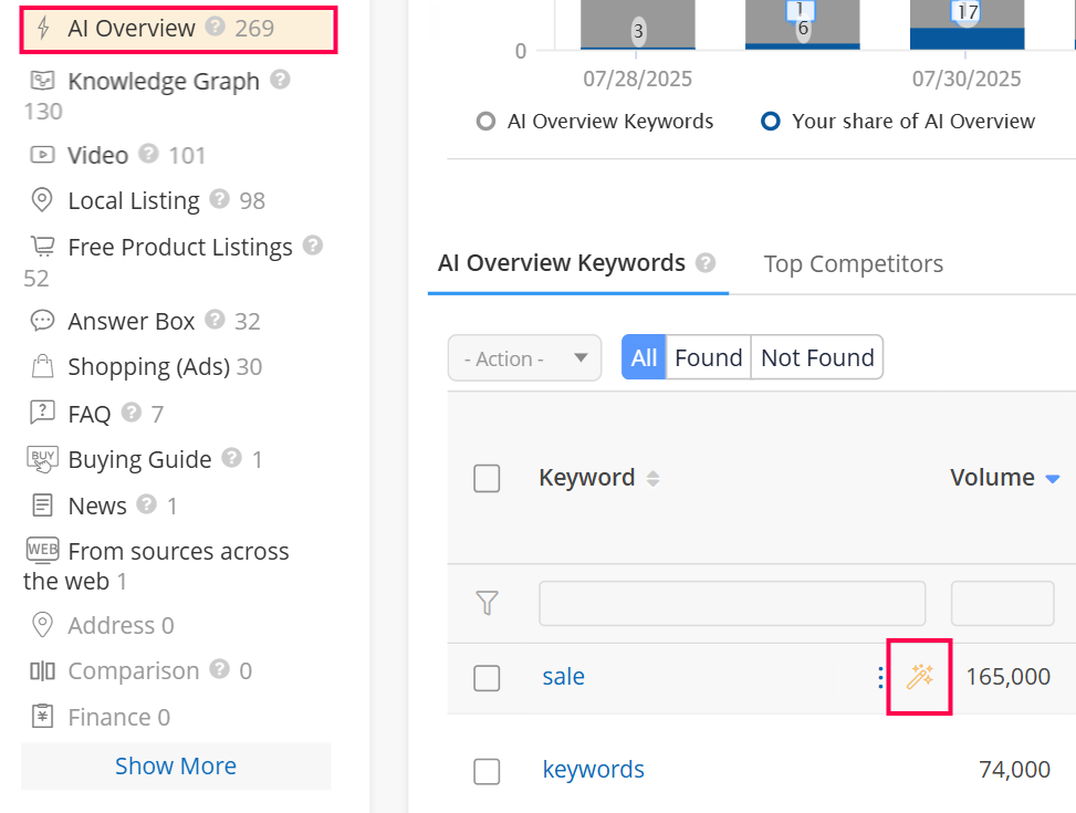 AIO Mode activates when analyzing a keyword that has triggered an AI Overview. Here’s how to access it: