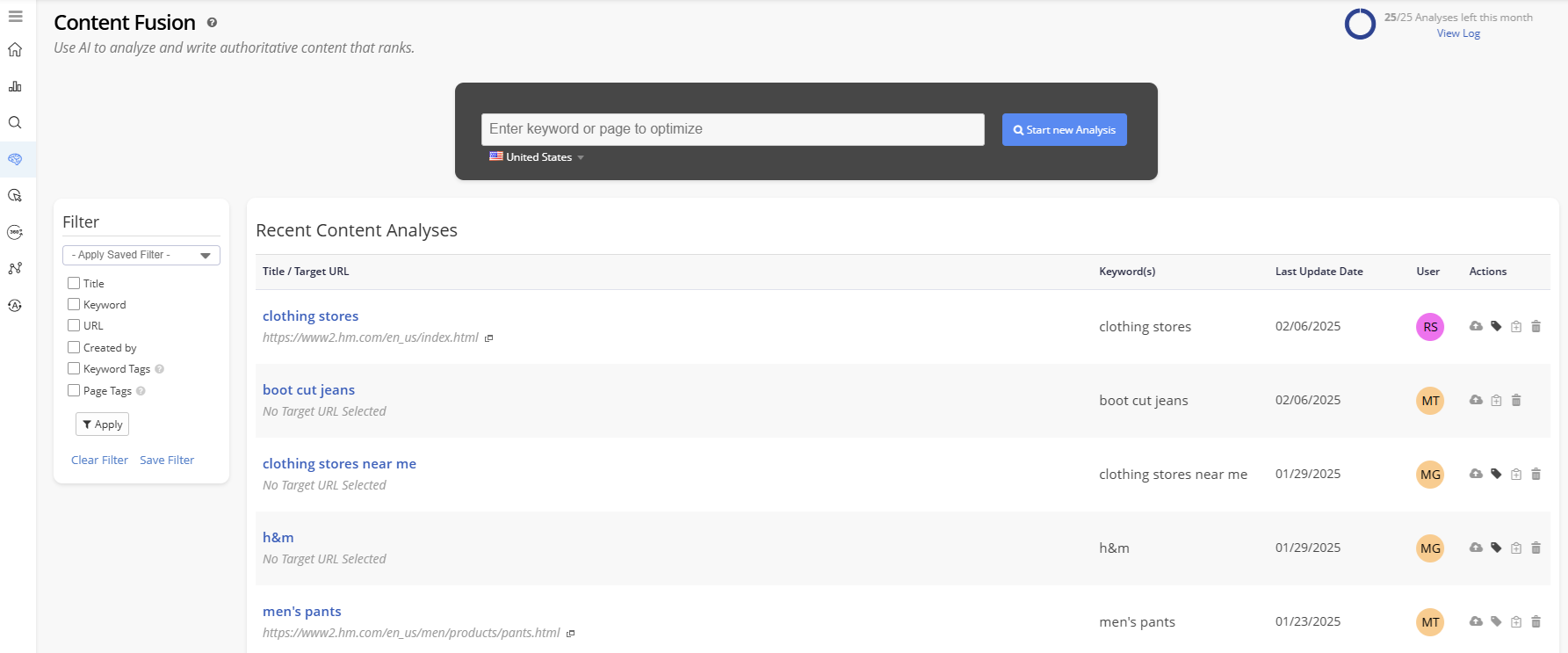 Start New Analysis: Input a keyword or URL to create a Content Fusion analysis for using the ranking data for the specified Country. Enter a keyword or topic for which you want content recommendations for or enter a URL to optimize content for target keywords from an existing page on your site.