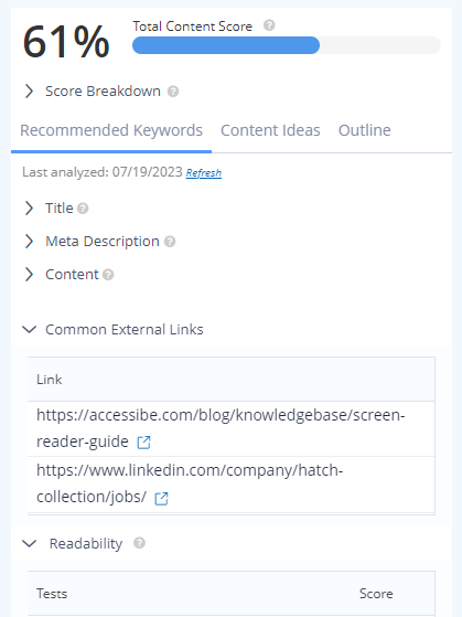Recommended Keywords: Displays a list of keywords you should consider adding to your content because they show up frequently in high-ranking content related to your topic.