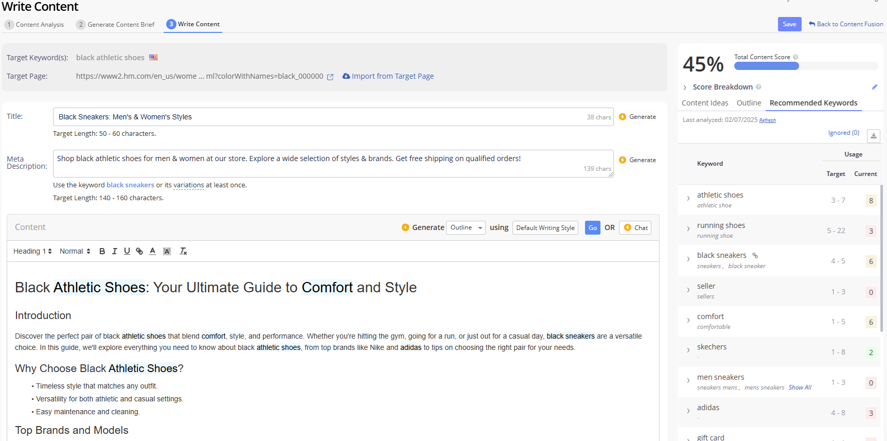 Save: Save the current analysis and content created using the Save button above the Content Score. It will appear in the list on the Content Fusion main page for future review/editing.