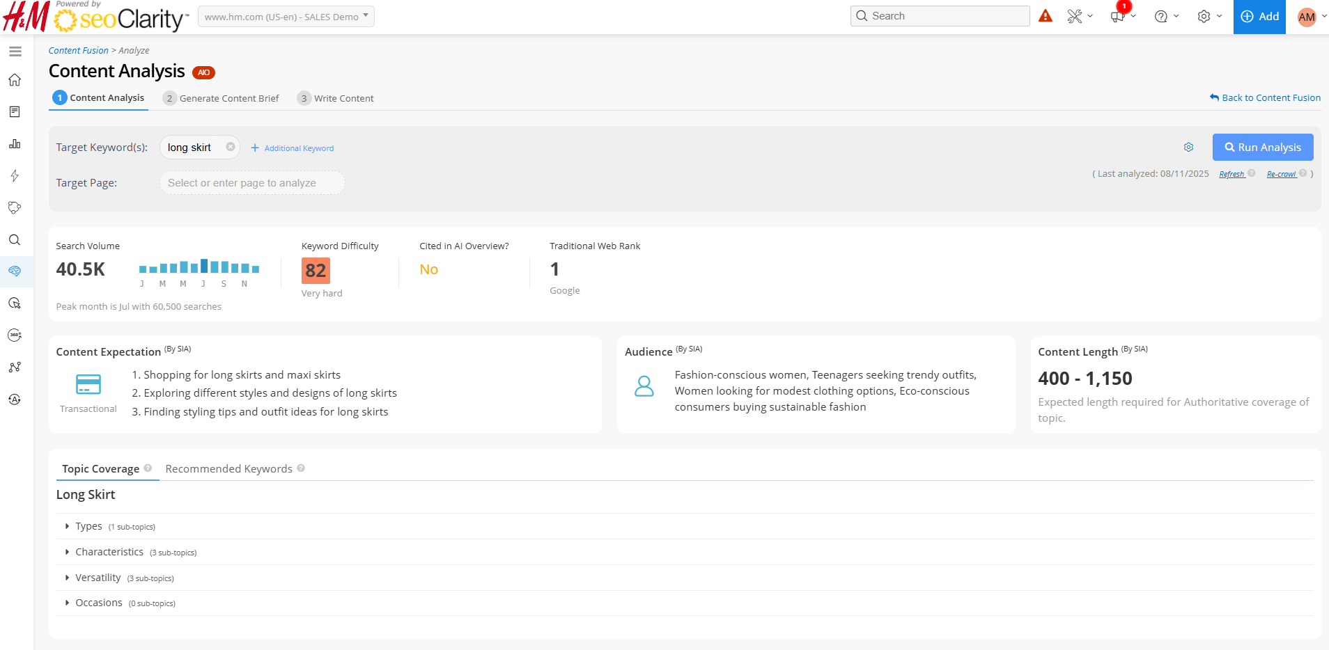 After clicking "Run Analysis" on any of input screens above, Content Fusion displays an analysis of the entered topic(s) and/or pages.