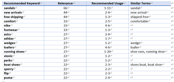| Similar Recommended Keywords for Title | {d.suggestedKeywordsForTitle.similarTerms} | Retrieves similar variations of the recommended keywords to use in the title |