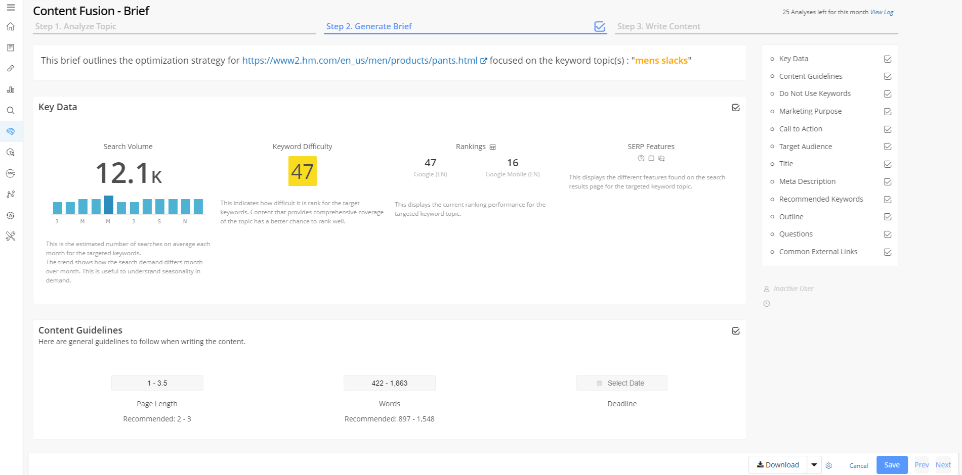 Content Briefs provide a customizable template that leverages user input and Content Fusion data. Templates can be modified via to generate a Content Brief template by using variable placeholders in the template to retrieve the data from seoClarity. Check out Content Fusion for more information.